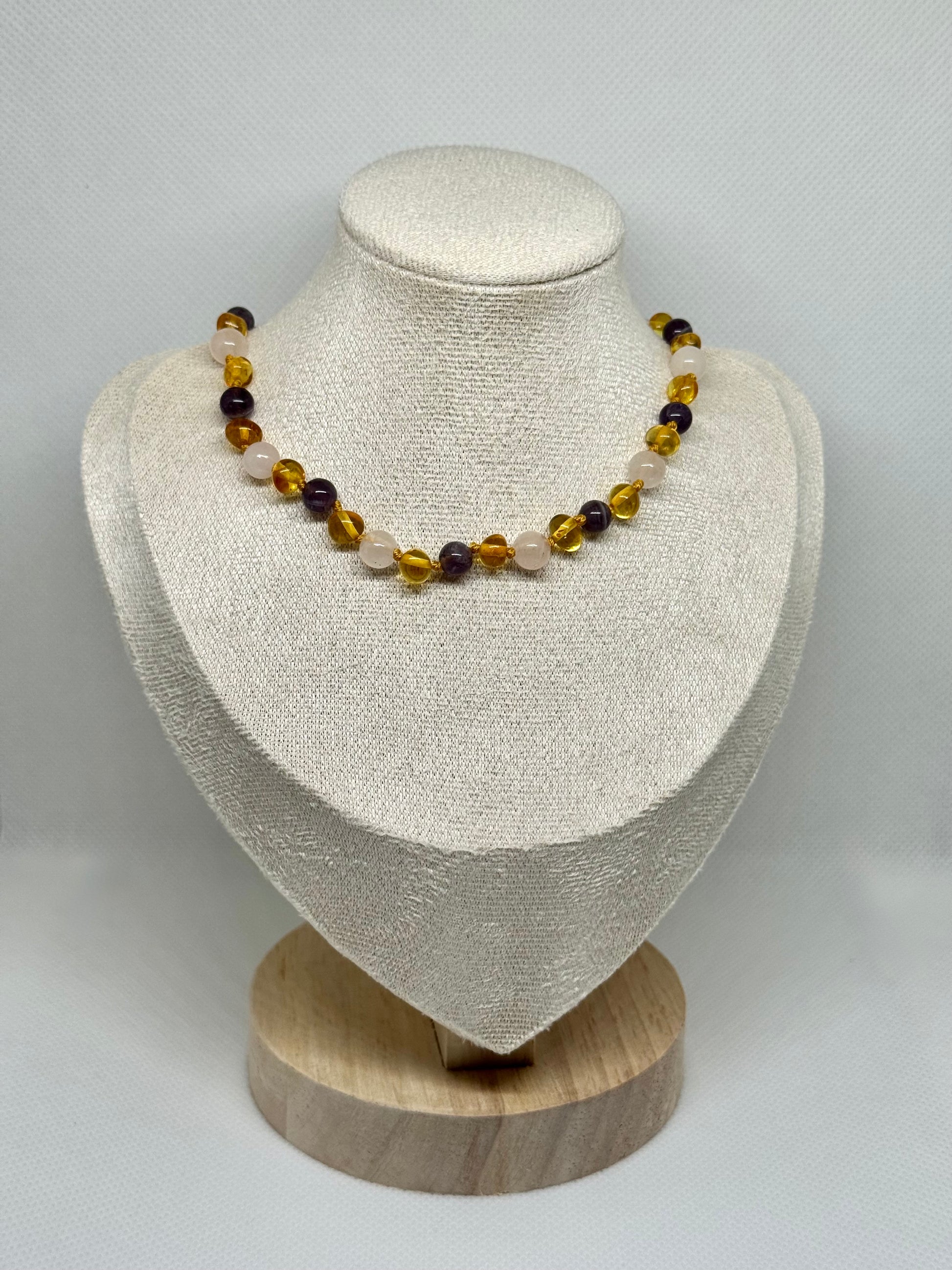 Barnsteen & Natuursteen Baby Ketting - Honing, Rozenkwarts & Amethist (32 cm)