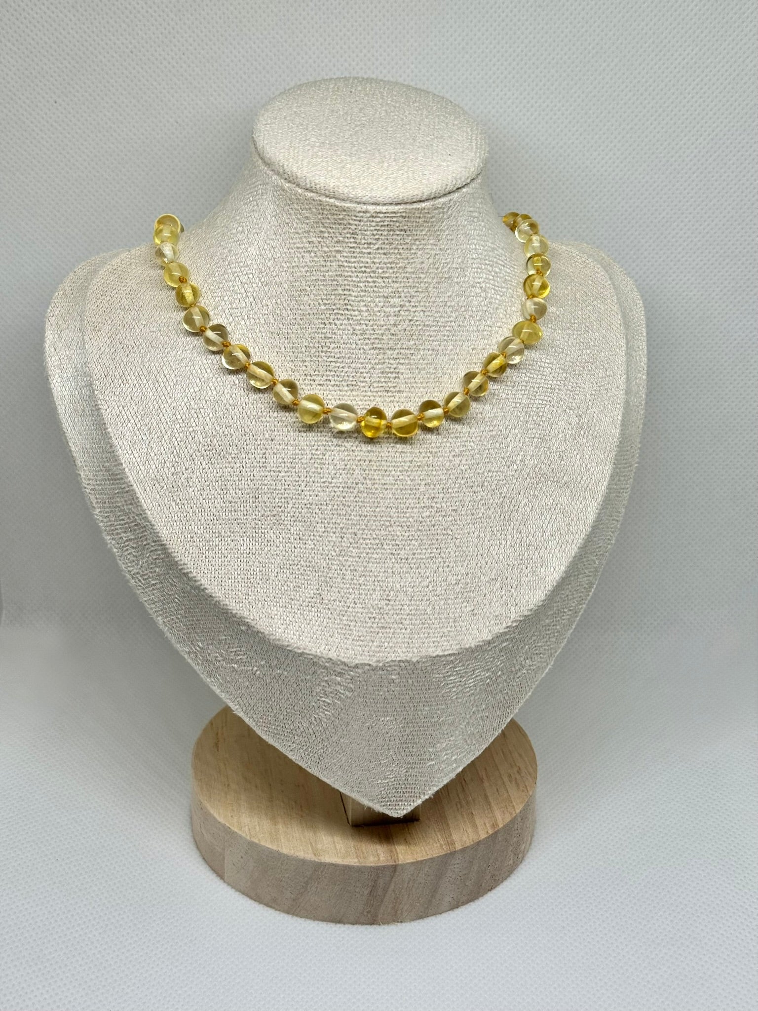 Handgemaakte barnsteen babyketting met veilige sluiting.