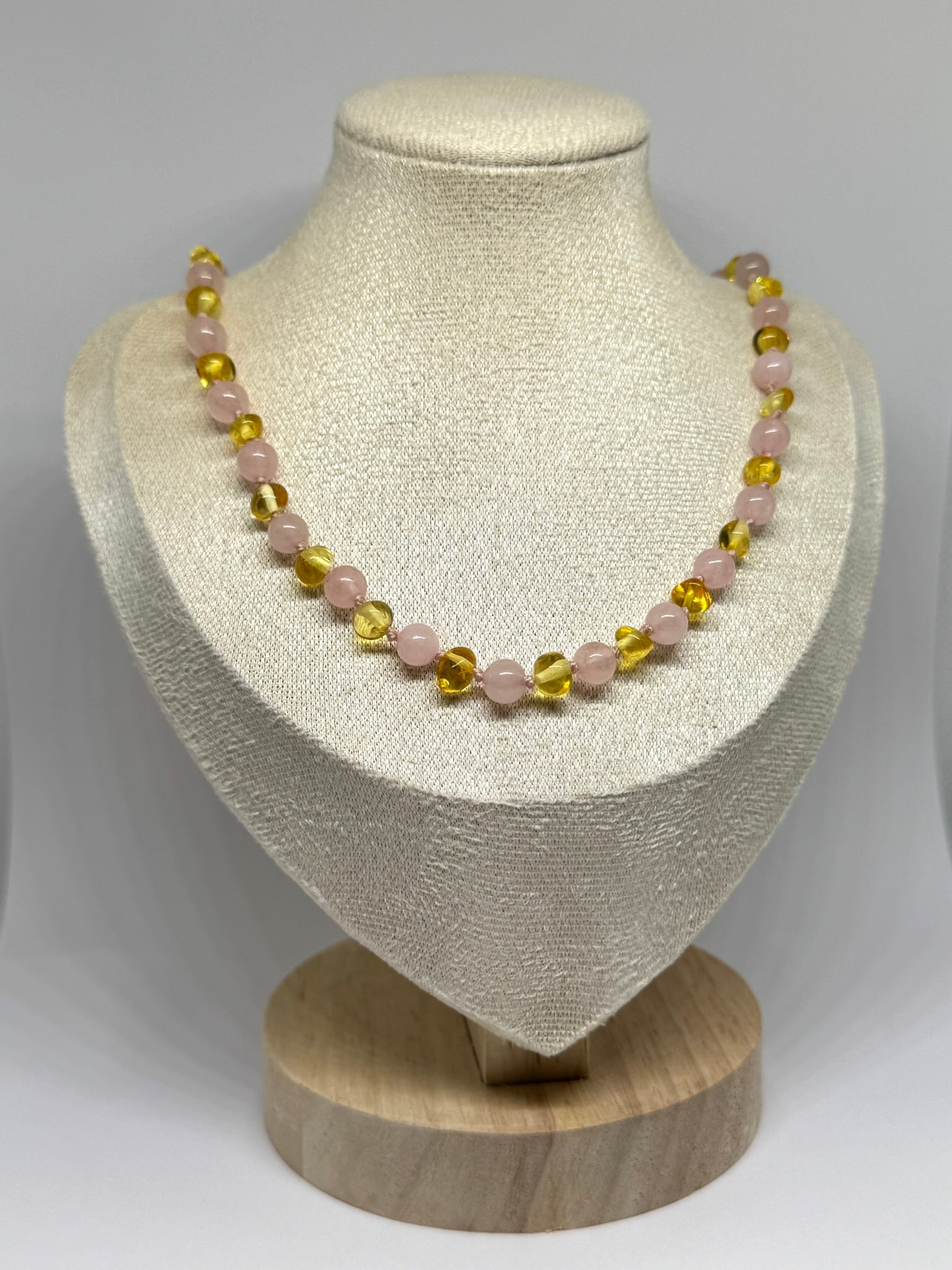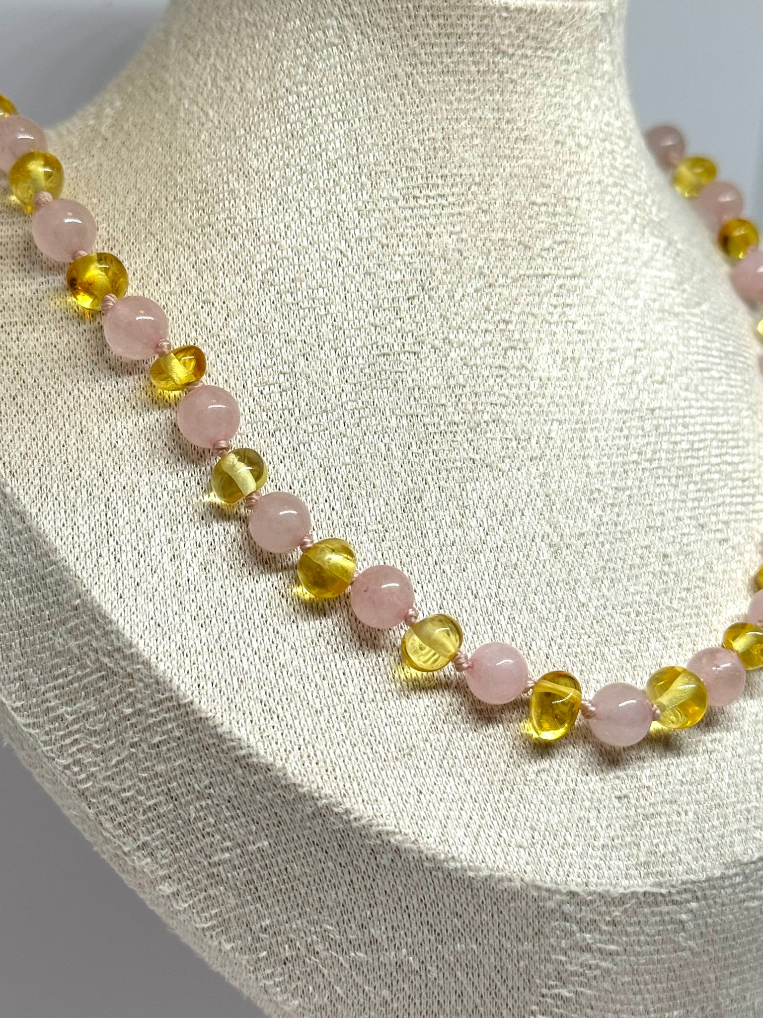 Ketting voor volwassenen, gemaakt van natuurlijke Baltische barnsteen en Rozenkwarts.